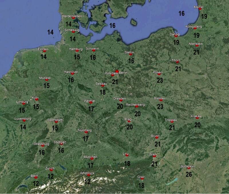 In Schleswig Holstein und am Alpenrand schwacher, sonst mäßiger bis frischer, an der Nordsee starker Wind aus Nordwest bis West. Von Oberösterreich bis ins Memelland mäßiger, an der Ostsee frischer Wind aus Südwest bis Süd, im Nordosten Mitteleuropas aus Südost.